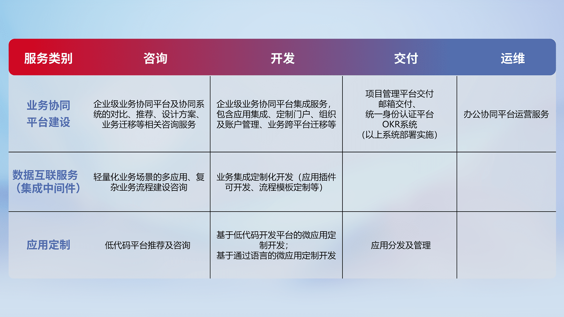 针对钉钉、、、企微、、、IDaas等平台级产品提供产品的规划、、方案、、、、交付、、、定制化开发等服务,,,,实现如统一协同办公、、智能客户服务、、、、混合会议管理、、、、智能数据查询、、等业务场景,,,实现数字化转型。。。。